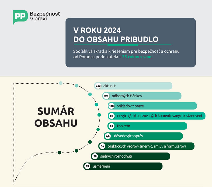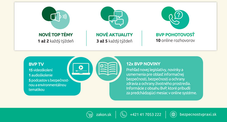 Zakúpením produktu získavate ročný prístup k celému obsahu s prepojením na súvisiace dokumenty a novelizovanú legislatívu, personalizovaným funkciám, videoškoleniam portálu www.bezpecnostvpraxi.sk.