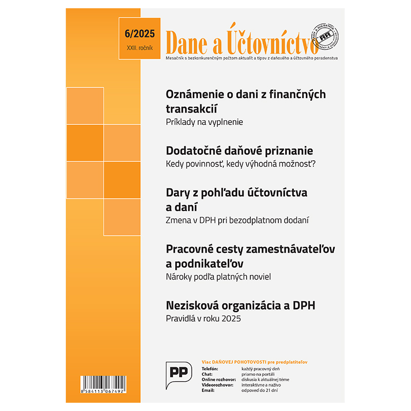 Aktuálne číslo DaÚ prináša zrozumiteľné návody k povinnostiam podnikateľov a účtovníkov v súvislosti s najnovšími legislatívnymi zmenami. Dozviete sa, kto musí podať oznámenie k dani z finančných transakcií, ako opraviť chyby v daňovom priznaní cez dodatočné podanie, ako správne zaúčtovať a zdaňovať dary a čo všetko vplýva na pracovné cesty v roku 2025. Nechýba ani rozbor novely o dorovnávacej dani pre veľké firmy a pravidlá uplatňovania DPH v neziskovkách. Všetko jasne, prehľadne a s množstvom príkladov z praxe.