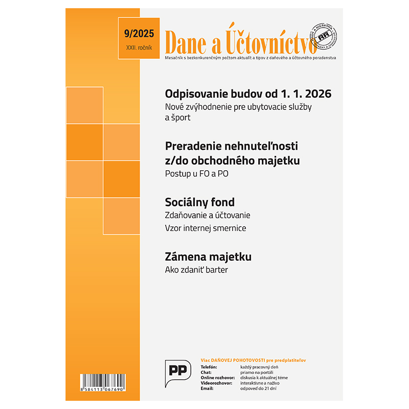 Septembrové čísle DaÚ otvárame predstavením čerstvej novely ZDP. Vysvetlíme, ako sa od 1. 1. 2026 zmení odpisovanie budov určených na ubytovanie a šport, a plynule nadviažeme témou, ako správne zaradiť alebo vyradiť nehnuteľnosť z obchodného majetku. Rozoberáme aj právnu úpravu daňových sankcií podľa Daňového poriadku a vysvetľujeme, čo hrozí pri porušení povinností. Z pohľadu DPH sa venujeme lízingu, vrátane najnovších legislatívnych zmien pri spätnom lízingu. V účtovníctve sa zameriavame na zámenu majetku a jej daňové a účtovné dôsledky. Nechýba ani téma sociálneho fondu – jeho tvorby, použitia, zdaňovania a účtovania – doplnená o praktický vzor smernice, ktorý môže využiť každý ...