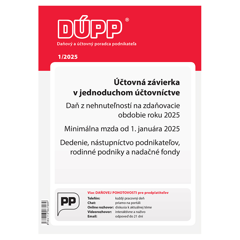 Prvé vydanie nového ročníka DÚPP zahŕňa praktické usmernenia pre spracovanie účtovnej závierky v jednoduchom účtovníctve za rok 2024 vrátane výkazov o majetku, záväzkoch, príjmoch a výdavkoch. Rovnako poskytuje detailné informácie o povinnostiach pri podávaní priznania k dani z nehnuteľností na zdaňovacie obdobie roku 2025, s ohľadom na zmeny v roku 2024. Zaoberá sa aj zvýšením minimálnej mesačnej a hodinovej mzdy od januára 2025 v súlade s automatickým výpočtom, zároveň rozoberá právne aspekty dedenia, prechodu obchodných podielov a pokračovania podnikania pri úmrtí podnikateľa.